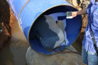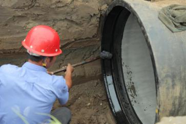 一截管道安裝完畢,王俊鉆進(jìn)了管道中,沿著新鋪設(shè)的這截6米長(zhǎng)的管道,一邊爬一邊觀察,檢查管道接口處的皮圈是否有縫隙,有沒有受擠壓而外露。見皮圈處平整無縫,王俊才放心地爬了出來。盡管當(dāng)天氣溫不高,但管道中密不透風(fēng),讓人喘不過氣,一趟爬下來,王俊的腦門上布了一層細(xì)細(xì)的汗珠。
