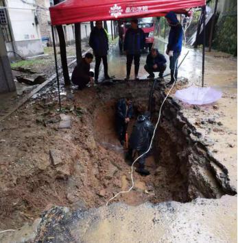 因爆管事件突發(fā),搶修人員趕到現(xiàn)場時(shí),水泥路面已塌陷出一個(gè)大坑,馬路上到處是積水,天空還下著雨。為了盡快修好爆裂管道,在最短時(shí)間恢復(fù)供水,搶修人員不懼艱辛,不顧泥水和雨水的困擾,齊心協(xié)力、緊張有序地進(jìn)行著漏點(diǎn)的搶修。經(jīng)過近4個(gè)小時(shí)的奮力搶修,終于完成了瑪麗醫(yī)院DN400PE管修復(fù)工作,保障了群眾正常用水。