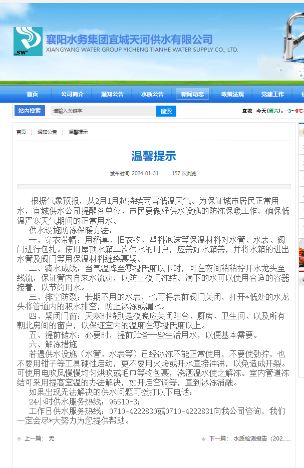 近日,我市出現(xiàn)強降雪天氣,極端低溫天氣易造成供水管網(wǎng)、水表、水龍頭等設(shè)施的凍損,影響市民用水安全。為保障全市供水安全穩(wěn)定,宜城天河供水公司堅持提前部署、預(yù)防為主、及時搶修原則,扎實做好寒潮及春節(jié)期間保障供水的防御和應(yīng)對措施準備。